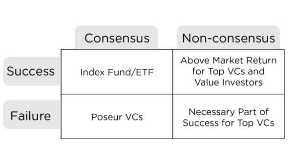 在知名风投人士Marc Andreessen的访问稿中, Marc的风投观念被总结成了如下的四象限图,分别以「舆论支持/不支持」、「成功/失败」为坐标轴。不得不说,这个思路很简单,但也非常有效: