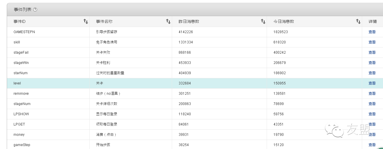 了解用户数据是第一步,《果冻消消乐》还去验证了玩家对目前游戏设计的使用情况。为此,他们使用了很多自定义事件的统计场景,根据消除类游戏的特性,对关卡使用情况、计费点消耗、道具消耗等情况进行定向埋点,查看和记录每一关用户数量和占比,来评估关卡设计是否合理,了解核心玩家的消费习惯,从而针对性的进行优化。