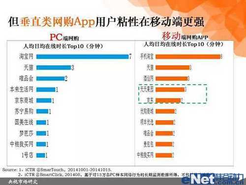 移动端,像淘宝、天猫依然保持在第一阵营。但是,很多垂直类的电商网站在用户的黏性上,用户更愿意花更多的时间在垂直类的电商上。像酒仙网、天天果园网、优购商城、顺丰优选、麦包包、我买网等等这样一些垂直类的电商网站。所以,移动端你的机会可能不是在平台上,更多是在垂直上,在垂直细分领域,在某一个品类上,你可能还是有很好的机会。因为平台我们个人觉得,像刚才大家看到的数据,第一梯队如果要做规模,在淘宝、天猫和京东它的规模上可能已经超出了其他的网站。也不是说没有机会,但是马太效应可能会越来越让他们的优势更加集中。但是,用户真正的黏性上,垂直电商上大家更多就是在细分这样的一些领域上。幸好我太太做的是垂直电商。
