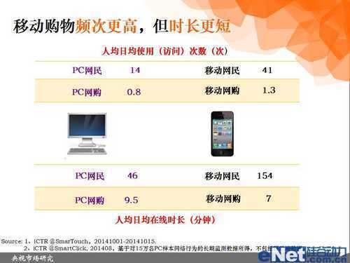 PC网购的用户,平均每个月31天当中,平均每天访问电商网站0.8次。移动用户平均每天自然天数当中,每天访问购物的次数是1.3次,这个次数远远高于PC端。看在线时长的指标,PC网民平均人均日均的在线时长46分钟,移动网民平均每天有154分钟是用于在线的,无论是你购物,还是你社交媒体,还是搜索等等,这个数字远远高于PC.但是,在人均在线时长的分布上可以看到,移动用户用于网购的时间,平均日均在7分钟,PC网购时长是9.5分钟。电商用户当中,他们有一个很重要的行为,就是比价,PC上可以很方便的进行比价,甚至包括一些专业的比价网站。但是,移动端,其实这些应用场景更多在移动当中,比如我老板,我们公司副总裁,他所有的电商花费都在移动端。因为他一年360天,有300天是在天上,剩下几天在去天上的路上,天天都在飞。他的购物行为全部是发生在去机场,或者酒店里面的路上。所以,他的决策也很短,很快。移动端,因为它不太给你有更多的,比如比价、挑选的余地,所以更多是很快速的进行消费。这是移动端的特点,就是频次更高,但是每次决策的时间很短。想起来哪儿,可能马上就去买,非常有目标,马上就下单,也不会有更多的犹豫。