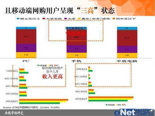 这些人群当中,他们其实也体现出来这么一个“三高”的状况。第一、学历更高,在移动端购物的这些消费者他们的学历更高。其次,收入更高。月收入6000元以上的占比移动端的用户更高。另外,他的收入高,在这些人群当中支出也高,平均月消费6000元以上的用户,也是移动端的用户。特别提醒大家关注月收入一万元以上,以及月花费一万元以上的用户当中,这群用户是平板的购物达人。他们在平板电脑购物的使用率远远高于其他的PC和手机端。
