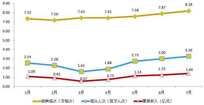 7月份,电影院线票房收入1.4亿元,环比上升12%,同比上升32.1%;放映场次为8.18万场,同比增长28.4%;观众人次达3.26百万人次,同比增长23.8%。