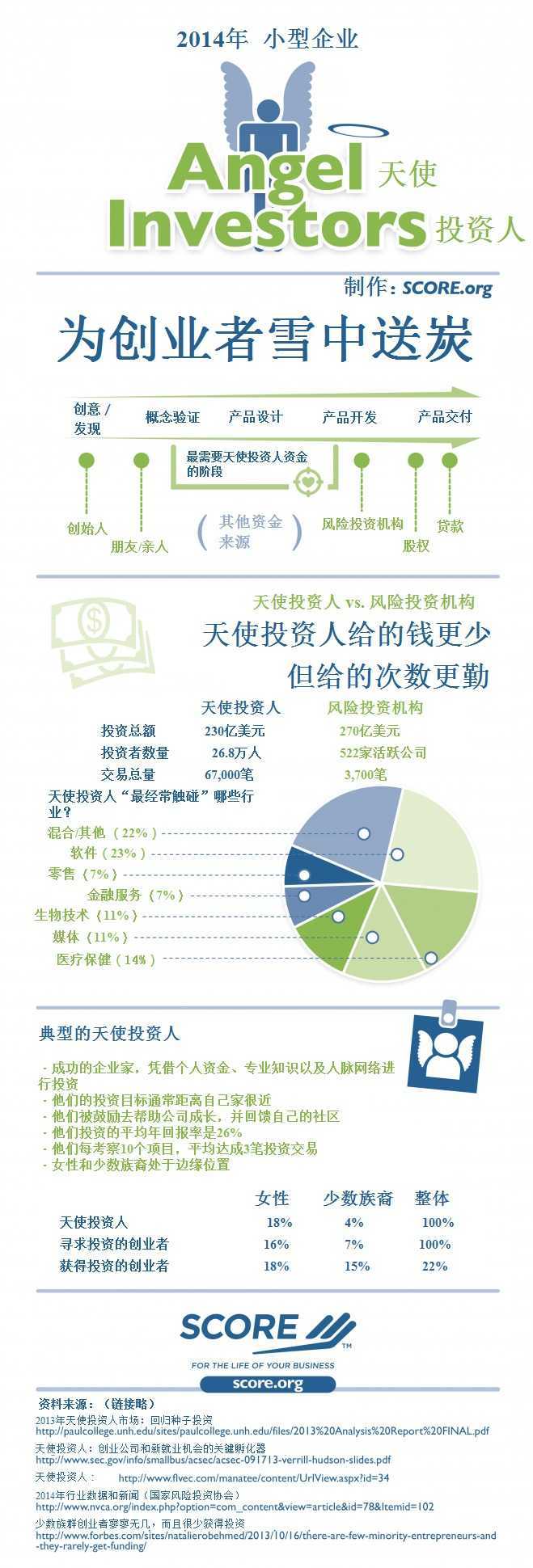 从天使投资者那里寻求资金的人,有84%都是男性,93%是白人。与此同时,在获得天使投资人资助的人当中,只有15%是少数族裔,女性则只占18%,而能够获得投资的整体比例是22%。请在下面的信息图中查看更多关于天使投资人的统计数据: