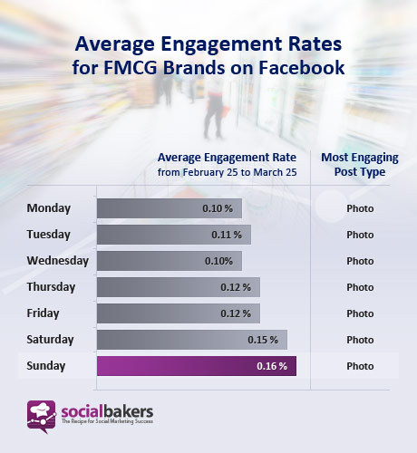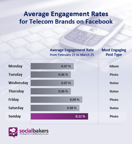 来自Socialbakers的数据显示星期天是Facebook品牌互动最高的日期,尤其是快速消费品和电信行业。