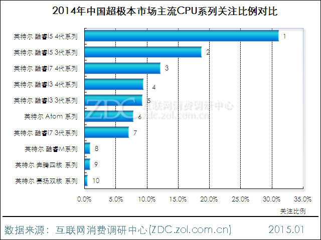 从产品所搭载的CPU系列来看,2014年采用Haswell架构的酷睿i5 4代系列关注度最为集中,所占份额达到31.2%。酷睿i5 3代系列和酷睿i7 4代系列产品分列第二、三位,用户关注度为18.8%和12.3%。