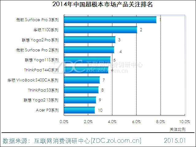 2014年中国超极本市场上,微软 Surface Pro 3系列凭借7.7%的用户关注度高居榜首,华硕T100系列以6.1%的关注比例获得亚军。