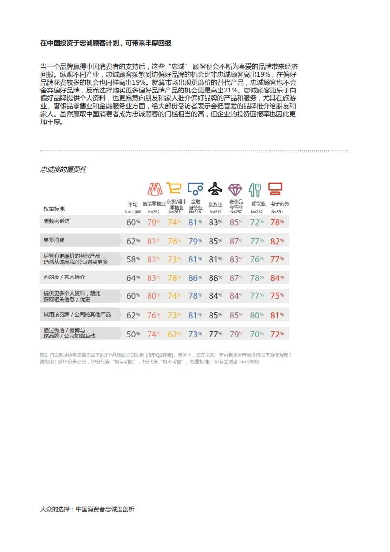• 中国市场的忠诚度投资回报率尤其可观。忠诚的顾客对偏好品牌的支持度增加,将会成为品牌抵抗低迷市况及竞争者的坚强堡垒。Epsilon 艾思隆的调查表明,在各个行业中,忠诚顾客经常光顾品牌店铺和增加消费的机会率,较非忠诚顾客高19%。忠诚客户也较乐于向品牌披露个人信息,且更有可能向朋友推荐其忠诚品牌的产品和服务。