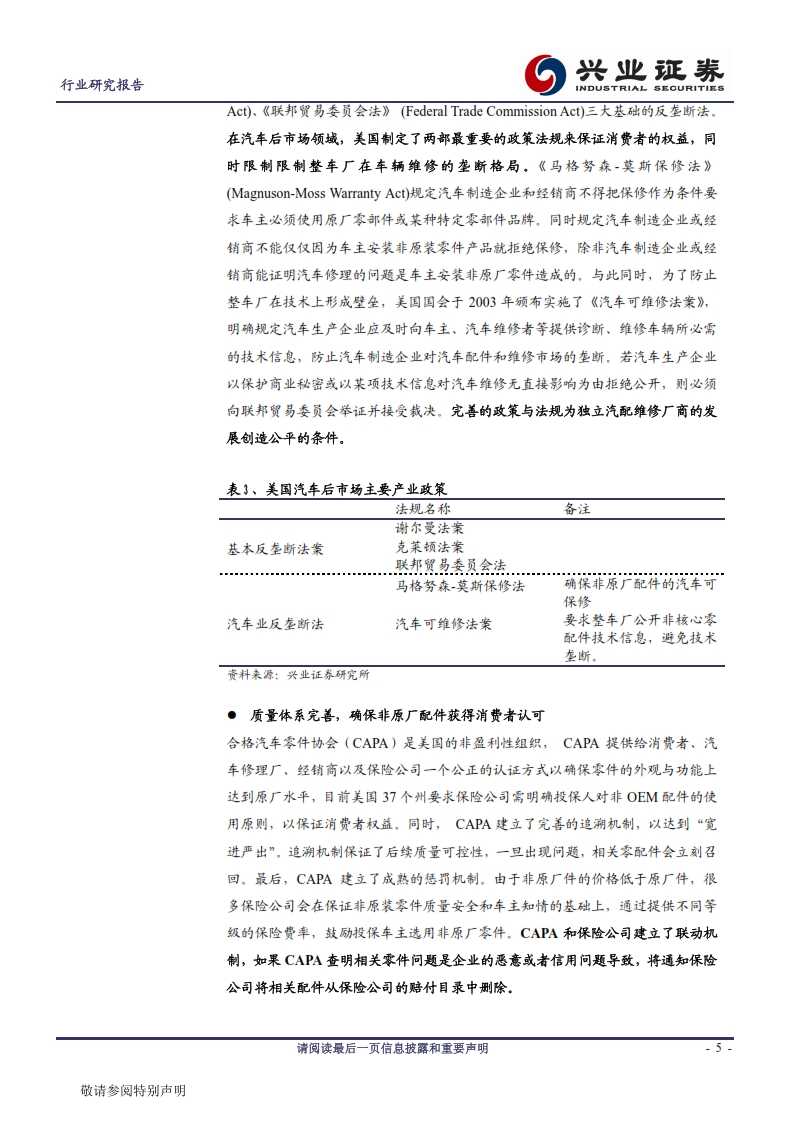 美国汽车后市场的壮大发展与政策支撑密不可分。我国自去年起已多个部门已出台多个法案破除后市场的垄断现状,这意味着汽车后市场发展的政策障碍被逐渐扫除,中国汽车后市场将迎来发展的黄金十年!l 美国的汽车后市场,先后经历了连锁化与互联网化,目前四大第三方汽配连锁巨头AutoZone、Advanced Auto Parts、O’Reilly、NAPA 占据后市场30%份额,成为行业主导,而汽车经销商仅占据25%以下的份额。我们分析认为,规模效应、供应链管理能力和物流体系是四大巨头核心竞争优势。