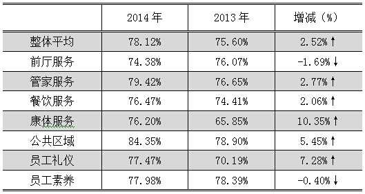 从检查结果来看,2014年的总体表现虽然较2013年略有回升,但大都低于国家星级标准所设定的达标要求,且前厅服务和员工素养有所下滑。各服务功能除了公共区域达到标准外,其它都处于基本达标水平(见下表)。