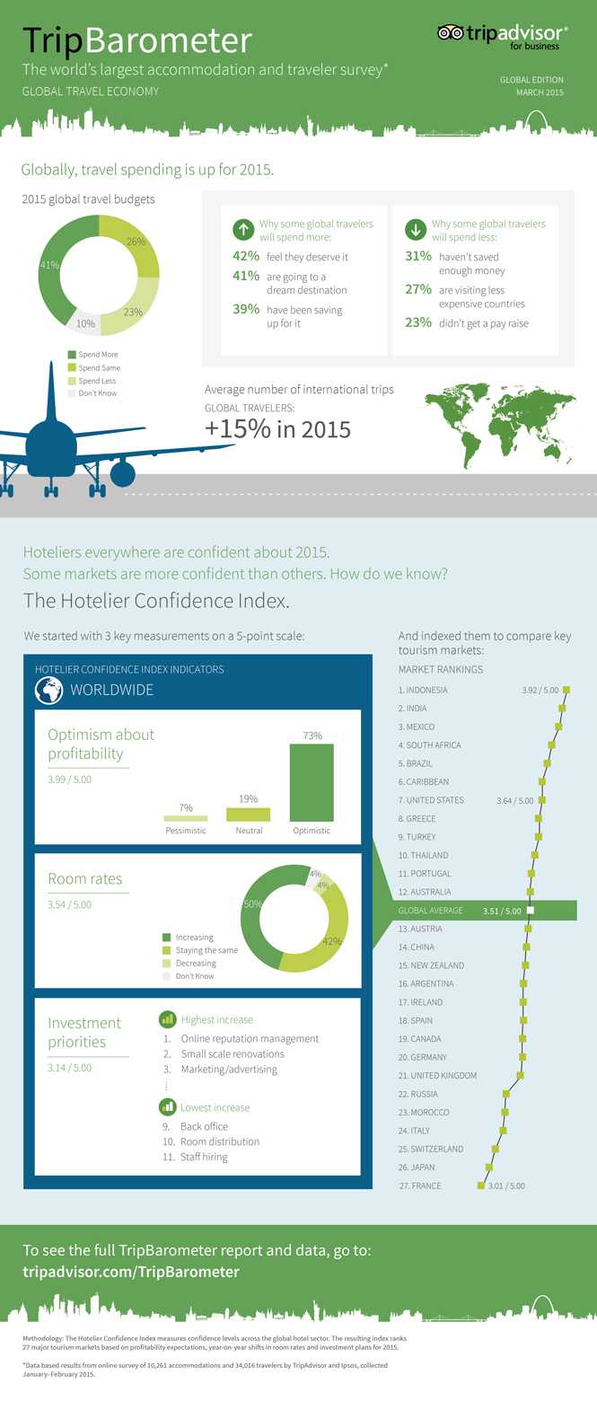 TripAdvisor亚太区有关负责人表示,本次报告勾画出了2015年旅游业的蓝图。数据显示,2015年中国游客又将增加旅游开销,并增加长途旅行的次数。
