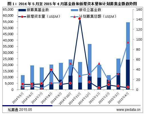 据清科集团旗下私募通统计,2015年4月中外创业投资及私募股权投资机构新募集和新设立基金数共计134支,其中60支新募集基金,披露募资金额54支基金,共募集金额16.84亿美元,74支新设立基金,披露目标规模26支基金,计划募资384.09亿美元。与3月相比,4月基金数量急剧增加,是3月2.2倍;新设立基金数量是3月基金数量的2.6倍,计划募资额高达384.09亿美元,是3月计划募资额的3.02倍,未来2015年,私募市场募资热情将空前盛大。