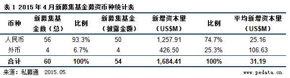 私募通统计结果显示,2015年4月中外创业投资及私募股权投资机构新募集基金共计60支,54支基金披露募资金额,新增资本量16.84亿美元,较与2015年3月25.69亿美元募资规模相比下降34.4%;与2014年同期的32.50亿美元的募资规模相比,下降48.2%;自2015年1月以来,新增资本量在缓慢下降,募资市场不景气;但新募集基金数量在持续增加,加大了私募股权市场的募资难度。4月新募集基金中,人民币基金共56支,募资金额为12.58亿美元,占比为74.7%;4支外币基金,募资总额为4.27亿美元,占4月募资总额25.3%。