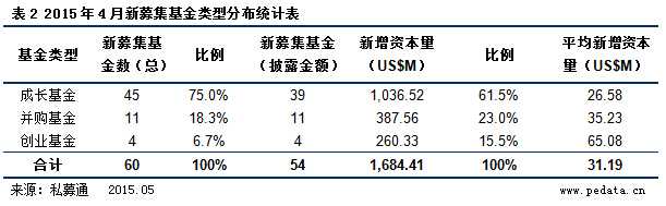 从基金类型来看,2015年4月新募集的有60支基金,共募集资金16.84亿美元;其中,当属成长基金最多,共有45支,占4月份新募集基金数的75.0%,披露募资金额39支基金,募集资金共10.37亿美元;并购基金11支,募集资金共3.88亿美元;创业基金4支,募集资金2.60亿美元。