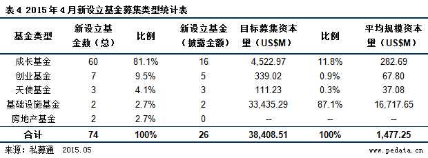 从基金类型来看,2015年4月新设立的有74支基金中,有26支基金披露目标规模,其中,有60支成长基金,披露目标规模的有16支,计划募资45.23亿美元;7支创业基金,披露目标规模的有5支,计划募资3.39亿美元;3支天使基金,计划募资1.11亿美元;2支基础设施基金,计划募资334.35亿美元;房地产基金2支,均未披露目标规模。