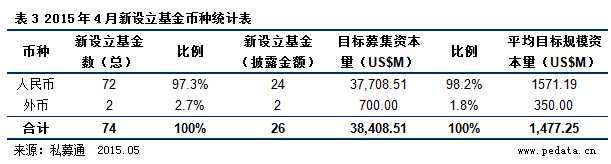 私募通统计结果显示,2015年4月份中外创业投资及私募股权投资机构新设立的基金数共计74支,披露目标规模的有26支,计划募集资金384.09亿美元,平均每支目标规模为14.77亿美元。其中,72支人民币基金,披露目标规模的有24支,计划募集金额377.09亿美元,平均每支目标规模为15.71亿美元;另外,2支外币基金,计划募集7.00亿美元,平均每支目标规模为3.50亿美元。4月之所以计划募资额高达384.09亿美元,是由于平安兴冀产业基金计划募集规模高达326.17亿美元(2000.00亿人民币),显著增加4月计划募资规模。