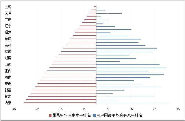 基于阿里大数据,我们将2013年用户网络平均购买水平的分地区排名排名同来自国家统计局居民平均消费水平的分地区排名放在一起,就能看出一些的结构差异。