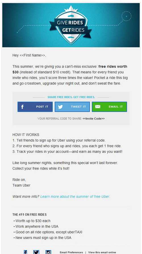 首次使用Uber后,Uber当地的社群经理将以个人名义给用户发送一封邮件。这封邮件除了为用户提供服务咨询渠道,同时将提供一个双赢策略,即用户通过社交、邮件转发分享带有优惠序号的这封邮件给朋友,用户和朋友都将分别获得奖励。邮件中暂时还仅支持facebook、twitter、email这3种分享方式。“赚取的优惠上不封顶”,笔者觉得还是蛮心动的。