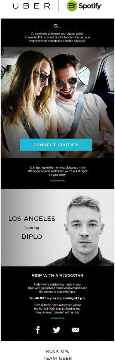 Uber和被苹果流音乐视为对手的流媒体音乐服务平台Spotify是结盟伙伴,目前在Uber APP中有直接连接到Spotify的入口,通过捆绑,Uber将会从Spotify的系统中,获取坐车人喜欢听的歌单,在用户乘车的时候通过Spotify的音乐库进行播放。以下是一封倡导音乐乘车的邮件,Uber介绍了Spotify,并且为用户提供和摇滚明星Diplo共乘的机会。