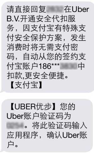 注册完成后,已有的用户的联系方式马上就发挥作用了。如用户在注册Uber时需要绑定自己的信用卡、支付宝,不需和司机有任何直接的现金交易,到目的地就可以下车走人。如注册时选择支付宝付款方式,那么支付宝之后会发送短信让用户回复是否同意乘车后自动扣款。Uber还会发帐号验证码给到用户以让用户去APP确认帐户。