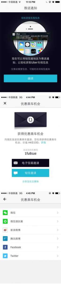 登陆Uber APP后,Uber会针对车程信息,再次主动咨询用户是否需要把“短信通知”改为“推送通知”,到目前步骤为止,Uber已经获得短信、手机、邮件、APP推送通知的多重渠道向用户传播信息。如果用户更喜欢用社交媒体分享带有优惠序号邮件和APP“优惠乘车机会”获取优惠折扣,那么理论上讲,Uber还将能获取用户包含微信、新浪微博、腾讯微博、Facebook、Twitter的所有社交渠道帐户信息。可惜,目前尚只有新浪微博、腾讯微博能够正常分享使用。全球领先的多渠道智能化营销服务机构Webpower的专家提醒,多渠道营销可以带来更好的效果,但是策略的正确规划和有效实施是成功的关键。打破在网站、邮件、短信等营销渠道间的独立隔绝,通过互相配合,共享用户在各营销渠道的历史行为数据,建立并不断完善用户的e-ID电子档案,并利用智能化的BI计算及预测模型,借助多渠道网络,进行千人千面的个性化内容推送,这样的无缝营销可以以最低成本正确触及最精准用户。