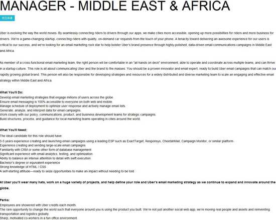 笔者再给大家看一则Uber招聘中东和非洲区域电子邮件营销经理的广告,为什么要看,因为从这则广告里,你可以清晰的了解Uber在邮件营销上真实策略和方向,这可能比很多公开言论更贴近实际。招聘广告的大体信息是:Uber是一家与世界移动性相关的公司,改变游戏规则的初创企业。为用户提供一次极好的经历对它们成功至关重要,它们正在中东和非洲寻找一个电子邮件营销摇滚明星来帮助支持其品牌开展数据驱动的电子邮件通讯活动。