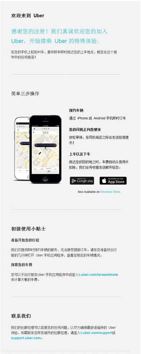 用户的邮箱中,同样会迎来第一封Uber的欢迎邮件。全球领先的多渠道智能化营销服务机构Webpower认为,以触发式欢迎邮件表达对邮件新订阅用户的欢迎和关怀,是与之建立沟通的好方法,善用包含一些特殊的优惠的触发式欢迎邮件,则能刺激收件人立即产生反馈行为。Uber在用户刚完成了注册后,会触发一封包含欢迎致谢、操作指南、新手贴士等新用户引导信息的邮件,让用户进一步了解Uber使用流程和注意事项。