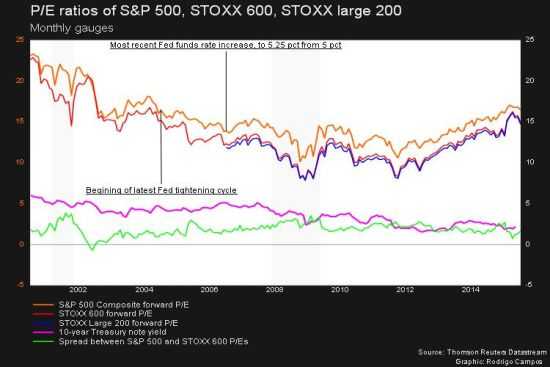 据汤森路透数据,虽然欧洲股市Euro Stoxx 600指数目前基于预估获利的市盈率为相对不高的14.9倍,但它自2002年中期以来一直都比标普500指数的估值便宜,现在这两个指数的估值差距与过去五年相比有所缩小。