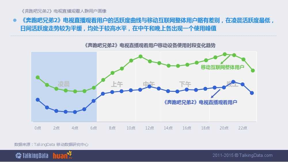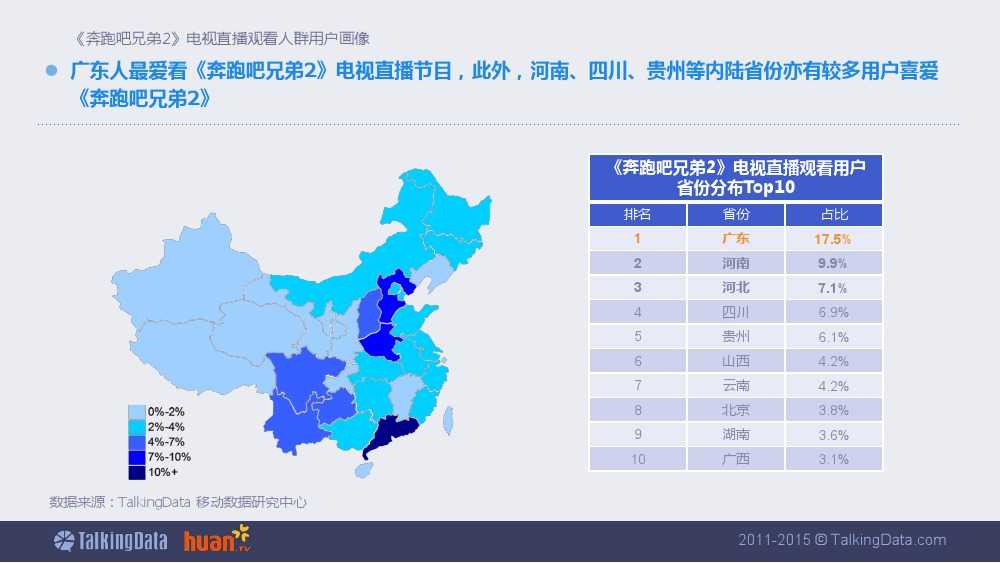 TalkingData:2015年奔跑吧兄弟2电视直播观看人群用户画像 更多阅读:TalkingData:2015年出行O2O移动应用行业报告TalkingData:2015年上门O2O移动应用行业报告TalkingData:2015年8月移动游戏BenchmarkTalkingData:2015年Q2 Apple Watch数据洞察报告TalkingData:见证2015年双11购物狂欢节移动应用的脉搏TalkingData:国内用户海外App使用报告TalkingData:2014年移动音乐应用行业报告TalkingData:2015年6月中国应用潜力榜单TalkingData:2014年移动外语学习类应用行业分析TalkingData:2015年移动新闻资讯行业报告TalkingData:2014年移动打车应用行业报告TalkingData:2014年移动电台应用行业报告TalkingData:支付宝钱包“聊天”分析TalkingData:2016年运动健康应用行业报告(附完整版下载)Talkingdata:2015美业O2O移动应用行业报告