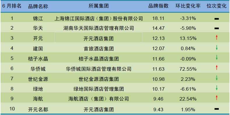 2015年6月,根据迈点旅游研究院(MTA)对国内高端酒店品牌品牌指数的不完全统计,本月国内高端酒店品牌风云榜TOP10依次是锦江、华天、开元、建国、桔子水晶、华侨城、世纪金源、绿地、海航以及开元名都。