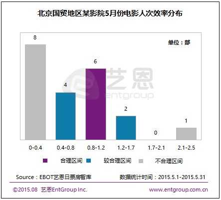 艺恩以人次效率为评价影院排片合理性的指标,人次效率是一部电影的人次占比与场次占比的比值,数值1为最优,实际人次效率与1的差值为偏离值,正偏离值说明场次过少,负偏离值说明场次过多。理想状态中一个影院的电影场次安排应该服从正态分布。该影院有9部电影排片不合理,占比43%,效率有待提高。