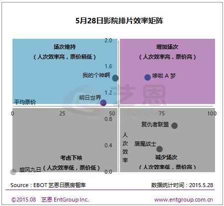 将人次效率和影片平均票价结合形成排片效率矩阵,《哆啦A梦》在次日需要增加场次,《我的个神啊》和《明日世界》维持现有场次即可,《屠魔战士》需要大幅度减场,不考虑其他因素的情况下,《旋风九日》可以考虑下映。
