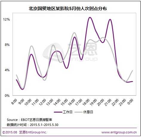 2、时点分布:工作日的黄金时点是18-19点,而休息日的黄金时点是16-17点。18-19点对于这家影院是个重要的时点,不管是工作日还是休息日,这个时点贡献的人次都占据了前三的位置,而这个时点的场次占比是相对较少的。