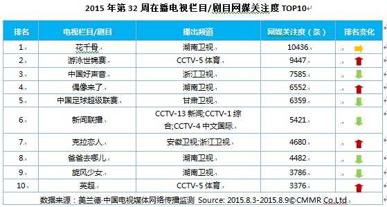 美兰德:2015年第32周电视节目网络传播指数 更多阅读:美兰德:2015年第31周电视节目网络传播指数美兰德:2015年第28周电视节目网络传播指数美兰德:2015年第35周电视节目网络传播指数美兰德:2016年第13周电视节目网络传播指数美兰德:2015年第51周电视节目网络传播指数美兰德:2015年第50周电视节目网络传播指数美兰德:2015年第29周电视节目网络传播指数美兰德:2015年第28周电视节目网络传播指数美兰德:2015年5月4-10日第19周电视节目网络传播指数美兰德:2016年第20周电视节目网络传播指数美兰德:2015年第49周电视节目网络传播指数美兰德:2015年第34周电视节目网络传播指数美兰德:2015年第33周电视节目网络传播指数美兰德:2016年第14周电视节目网络传播指数美兰德:2015年第37周电视节目网络传播指数