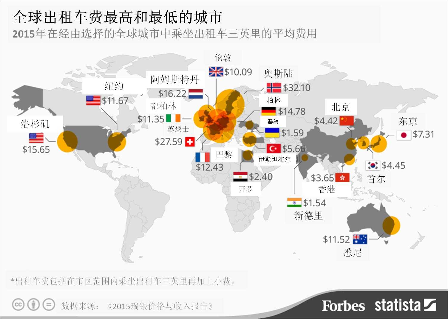 实际上,花费同样多的钱,你可以在开罗搭出租走41英里。基辅和新德里更加便宜,三英里车程分别只需1.59美元和1.54美元。在纽约搭出租走相同的路程要花费11.67美元。