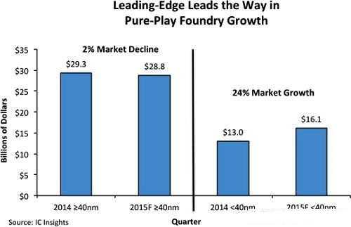 ICInsights估计,40纳米以下制程节点纯晶圆代工市场将在2015年成长24%,达到161亿美元的规模;该数字在2014年为130亿美元。至于40纳米及以上制程节点市场,估计2015年将衰退2%,来到288亿美元。