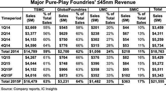 下表显示全球四大纯晶圆代工业者的45纳米及以下制程节点在2014年与2015年各季的销售业绩;ICInsights预期,台积电(TSMC)的2015年整体销售额中,有63%是来自于45纳米及以下制程技术。此外台积电在2015年估计有57亿美元销售额来自于20纳米及以下制程(其中20纳米制程营收估计51亿美元,16纳米制程营收估计6亿美元)。