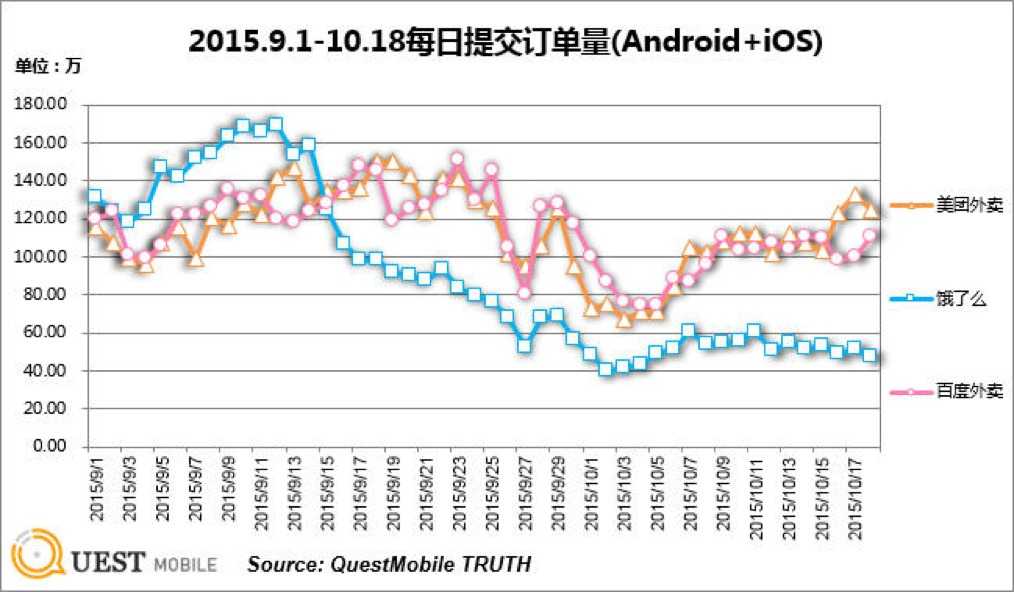 总体上看,相比团购,外卖领域的分化没有团购领域那么明显,厮杀更加激烈。具体来说,2015年9月,包括安卓和苹果的整个移动端,美团外卖的每日提交订单量大多在100万到140万之间波动,最高接近160万单(这显然与其活动推广有关),每日线上支付订单量在100万左右波动,最高突破120万单。