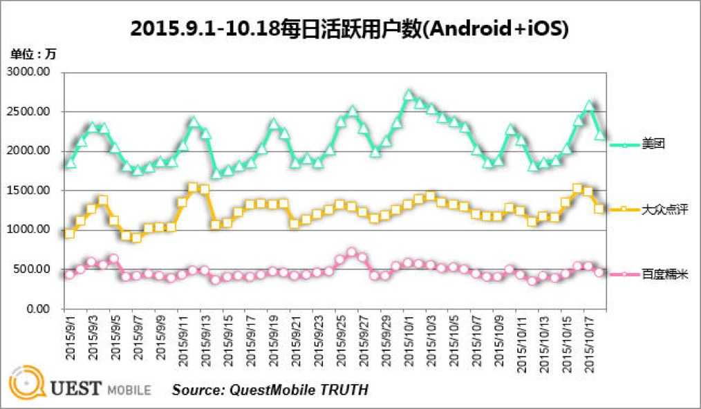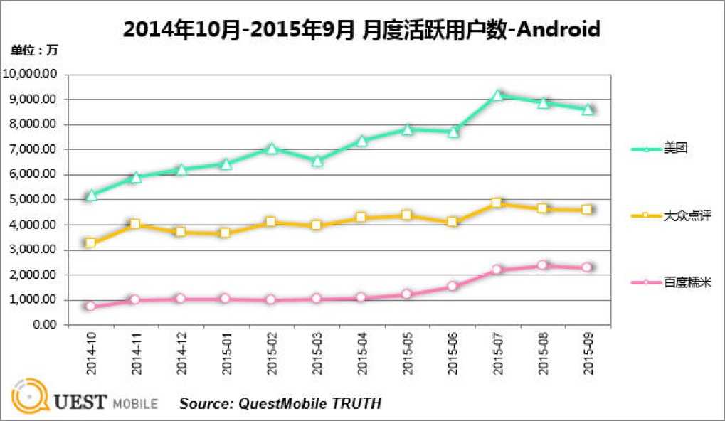 大众点评和百度糯米也好不了多少,具体的变化状况,各位不妨自己看。爷们的话就勇敢一点,看看刚刚过去的九月数据:安卓用户、iOS用户数上,美团分别是8597万、4857万,大众点评4582万、4755万(大众点评的iOS用户比例真是高),百度糯米2254万、1164万。