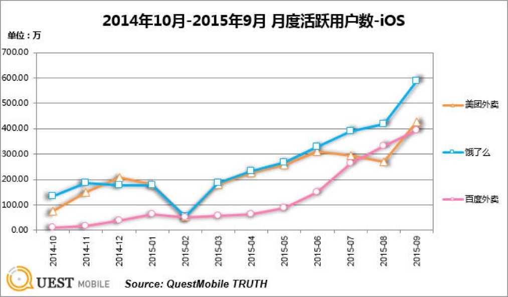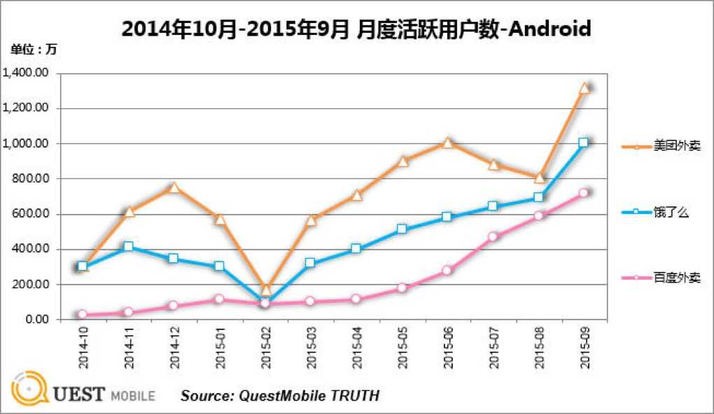 总体上看,抛开季节性因素,美团外卖、饿了么都较早发力,去年就持续强推,百度外卖发力较晚,今年才开始,不过呢,到目前来看,百度外卖已经成功上位:到2015年9月,安卓用户、苹果用户数上,美团外卖是1318万、427万,饿了么是1001万、587万,百度外卖是718万、393万。