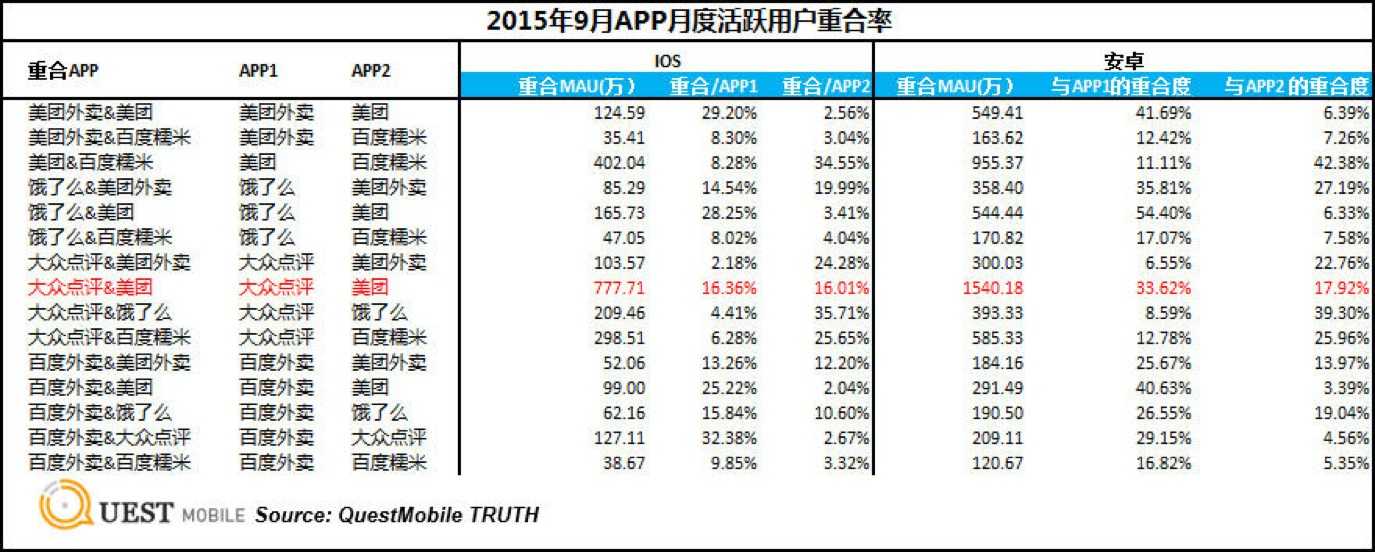 1.在团购领域,iOS端,美团和大众点评的重合度真心不高;外卖领域,饿了么和美团外卖的重合度较高。