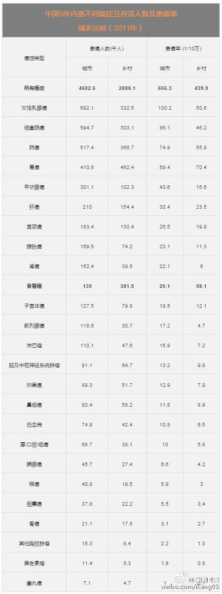 数据显示,城市地区的5年患癌率明显高于乡村,这可能与城市地区癌症发病率高、医疗条件好,生存期长及乡村地区的死亡率高,生存率低相关。