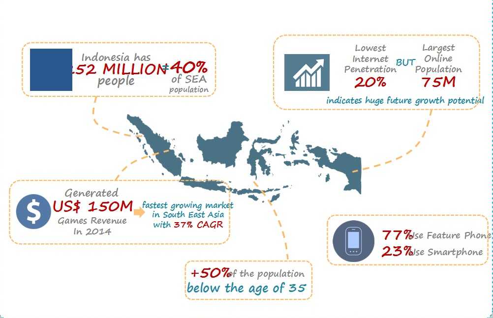 * 在2014年印尼产生1.5亿美元的游戏收入,这是在东南亚增长最快的游戏市场,移动迎头赶上。
