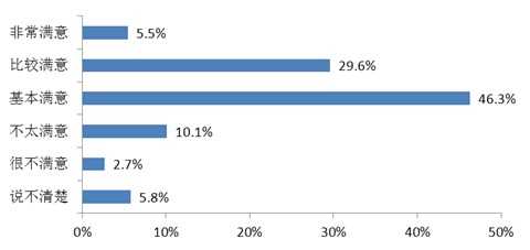 (一)多数进城务工人员对当前在城市的生活感到满意和较为满意。调查显示,有84.3%的受访者对在城市的生活感到非常满意、比较满意和基本满意,占比分别为5.5%、29.6%和49.2%,对在城市的生活感到很不满意的只占2.7%。此外有96.4%的受访者表示在城市工作生活没有或偶尔有不受尊重的经历或感觉。上述数据一方面显示出城乡居民身份差异在明显缩小,另一方面显示出进城务工人员对城市生活的适应度较高。