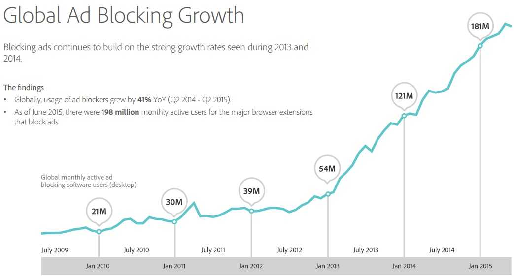 PageFair发布的最新数据显示了广告拦截市场正在发展,2015年第二季度全球广告拦截应用用户和去年同期比增幅41%,达到1.98亿人。