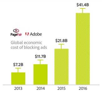 预计2015年由于广告拦截服务全球网络广告收入将损失218亿美元,到2016年这个数字将达到414亿美元。
