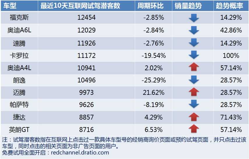 根据缔元信红渠汽车互联网营销数据库的试驾潜客数据,筛选出SUV、轿车和MPV下最近10天最受互联网购车用户关注的车型,并就这30款车型进行本周的销量趋势预测。