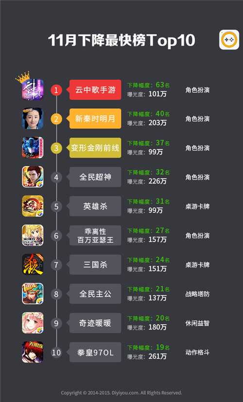 二、11月份百强手游曝光度Top 10与百强游戏类型分布