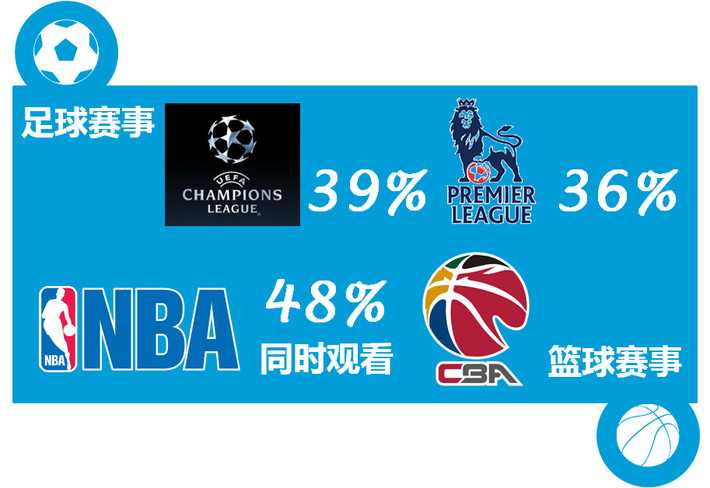 在足球赛事中,欧冠(39%)和英超(36%)观看率最高。另外,中超观众当中有8%的人在过去一年里去到过现场观看中超赛事。篮球赛事的观看选择并不多,NBA和CBA分别获得了56%和34%的收看率,其中同时观看这两项赛事的人群比例接近一半(48%)。