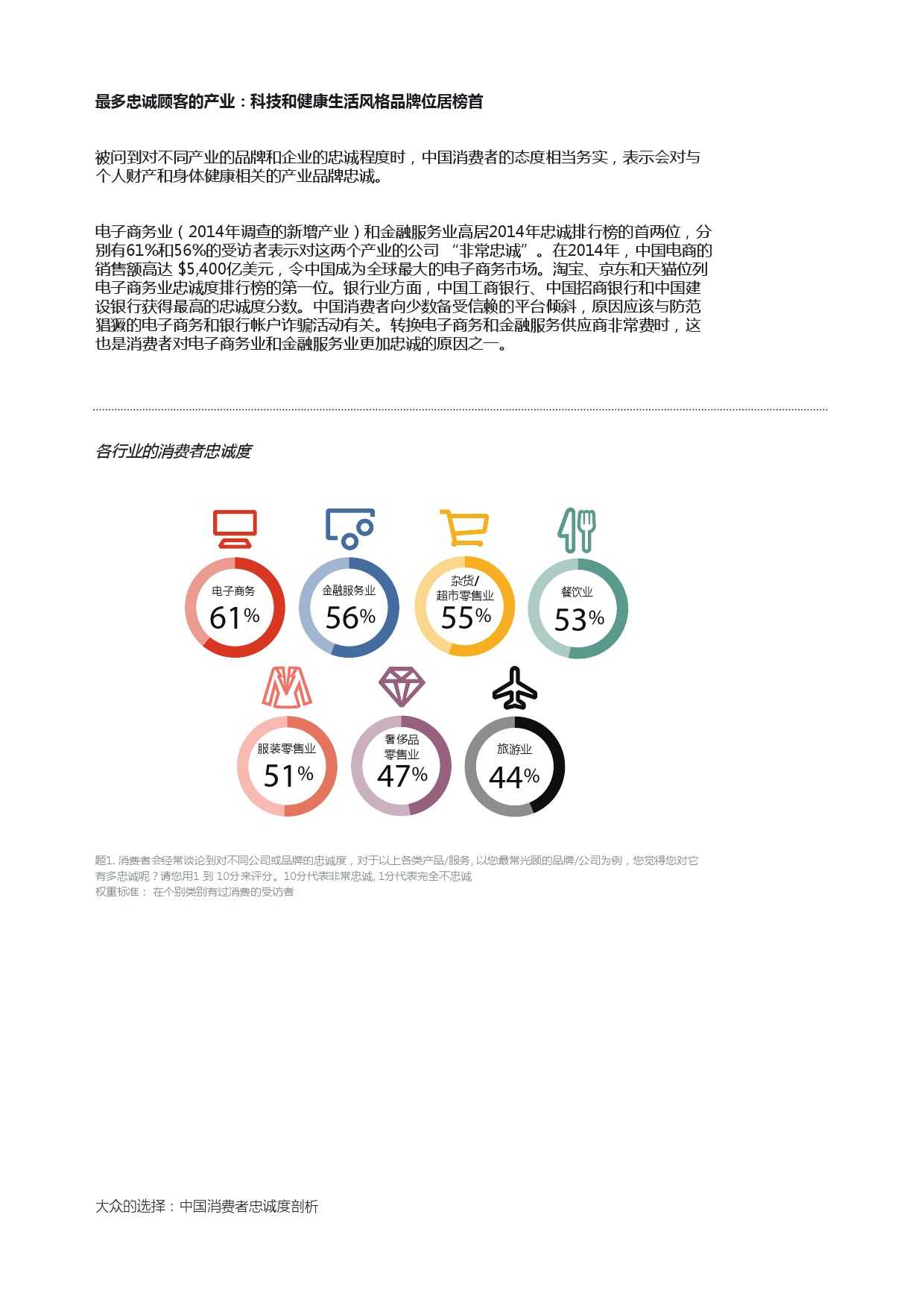 大众的选择:中国消费者忠诚度剖析 中国消费者对科技品牌的忠诚度最高,尤其是淘宝和京东等电子商务公司。61% 的受访者表示对该产业的品牌忠诚。在所列举的品牌中,苹果获得最高的忠诚度 评分,有17%的受访者表示他们是苹果品牌的忠实顾客。我们的研究发现,最容 易取得中国消费者青睐和忠诚的企业,是那些善于整合线上和线下的接触点以带 来流畅客户服务体验的企业。直接影响消费者健康水平的生活品牌(包括杂货连 锁店和餐馆)与金融服务品牌也获得较高忠诚度评分。忠诚度品牌排行榜更是首 次出现在今年的调查中。 更多阅读:大众的选择:中国消费者忠诚度剖析2017中国消费者调查报告:“双击”中国消费者尼尔森:2015年Q1中国消费者信心指数了解中国消费者——从消费升级到消费降级中国消费者为何会持续让世界惊艳Epsilon:调查显示70%的中国消费者对售价和折扣信息最感兴趣CTR:2016年中国3.15消费者将聚焦哪个行业?尼尔森:2015年Q3中国消费者信心指数保持强劲态势Crunchbase:2018年中国初创企业已经获得938亿美元投资在中国,只抓一个权健是不够的ZEBRA:2023年全球消费者调查Kearney:首份消费者压力指数Qualtrics XM Institute:2024年消费者满意度和忠诚度调查报告SOCi:2024年消费者行为指数KCI:2023年Q4消费者调查报告