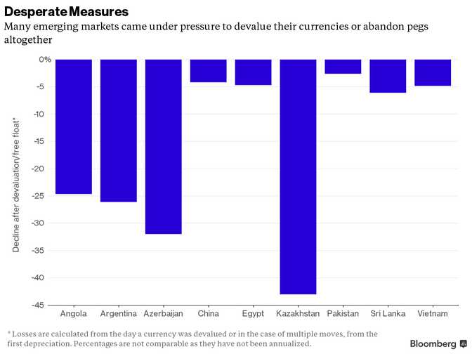 在中国央行大幅下调人民币中间价一周后,越南央行年内第三次采取让本币贬值的措施,拓宽货币交易区间;哈萨克斯坦随后宣布让汇率转为自由浮动,当天本币坚戈爆贬30%;次月斯里兰卡放宽汇率管制;此后一个月,埃及决定年内第三次主动让本币贬值;本月南苏丹、阿根廷和阿塞拜疆先后宣布取消汇率管制。